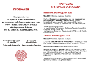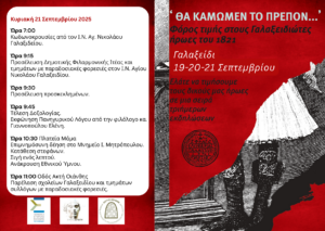 Η Περιφέρεια Στερεάς Ελλάδας και ο Δήμος Δελφών διοργανώνουν σε συνεργασία με συλλόγους, φορείς και εθελοντές, τις επετειακές εκδηλώσεις μνήμης και τιμής στους Γαλαξιδιώτες ήρωες του 1821, «Θα Κάμωμεν το Πρέπον», από την Παρασκευή 19 έως την Κυριακή 21 Σεπτεμβρίου 2025.